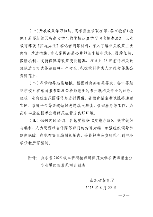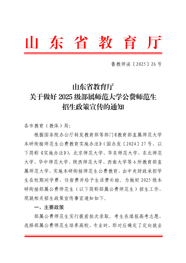 山东省教育厅关于做好2025级部属师范大学公费师范生招生政策宣传的通知