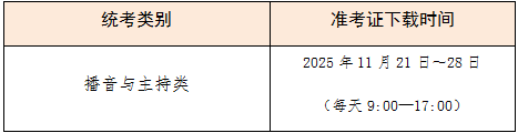艺术类专业统考准考证由考生本人自行网上下载。符合上海市高考报名资格、已在网上报名参加本市播音与主持类专业统考并完成网上付费的考生须登录“上海招考热线”网站(www.shmeea.edu.cn),点击页面下方的“考试报名”栏目进入,下载并打印本人艺术类专业统考准考证。下载时间安排如下: