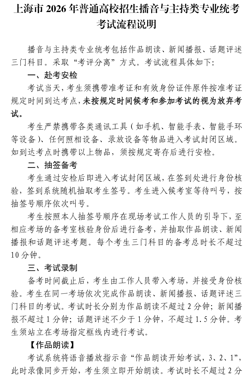 1.播音与主持类专业统考采取“考评分离”方式,分批、分时段进行考试,考生须按照本人准考证上的报到时间准时到达报到地点(报到地点为昌林路800号-南门,校区其他校门届时将关闭,不予通行),并接受身份验证等入场检查。报到后考生须听从现场工作人员指引进入封闭区域参加考试,需完成全部考试科目后,方能离开封闭区域。