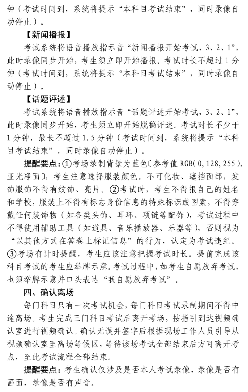 5.考试过程中,考生不得报自己的姓名和学校,服装上不得有标志身份信息的特殊标识或图案,不得穿戴任何装饰物(如各类头饰、耳环、项链等配饰),不得使用辅助工具(如道具、音乐播放器、乐器等),否则视为“以其他方式在答卷上标记信息”的行为,认定为考试违纪。
