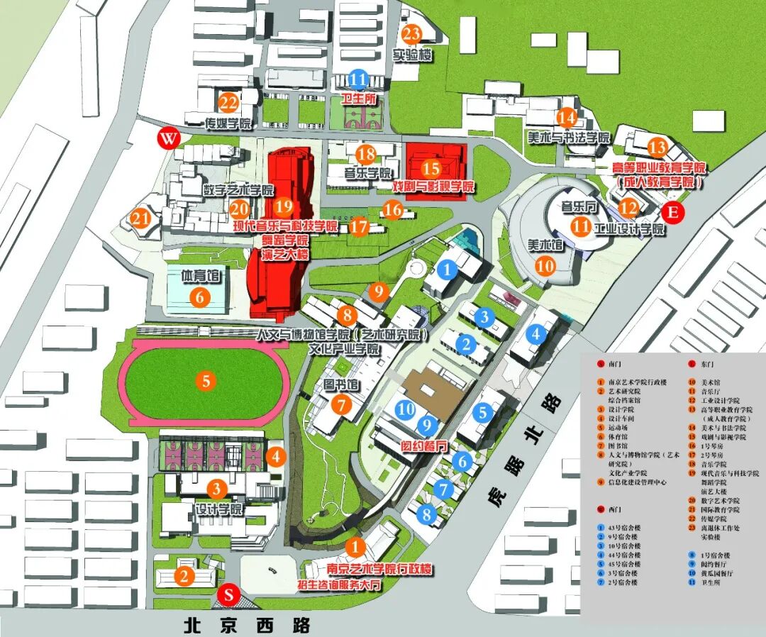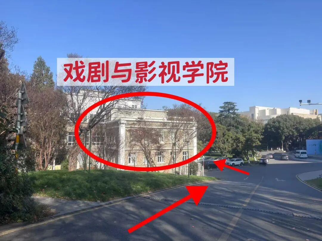 表(导)演类考生从南艺南门进入后,经过上海美专牌坊石门,经由设计学院旁坡道向前直走,途经操场后经过演艺大楼后,经由道路下坡至百岁泉区域可达戏剧与影视学院考试区域。