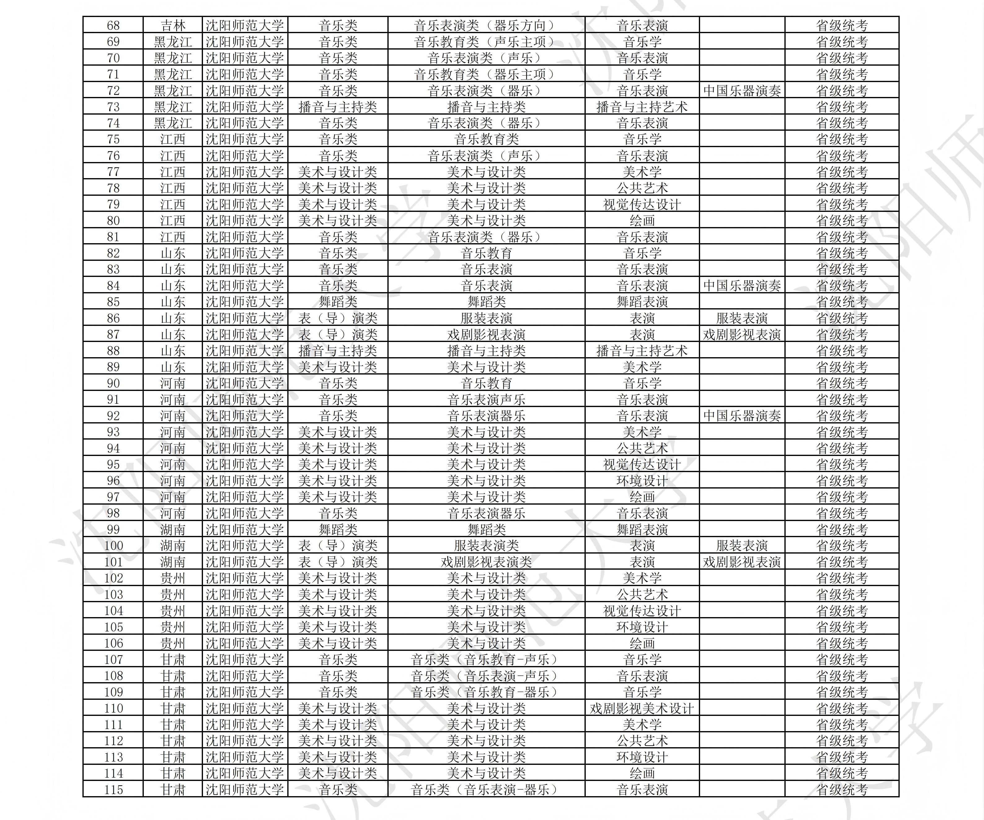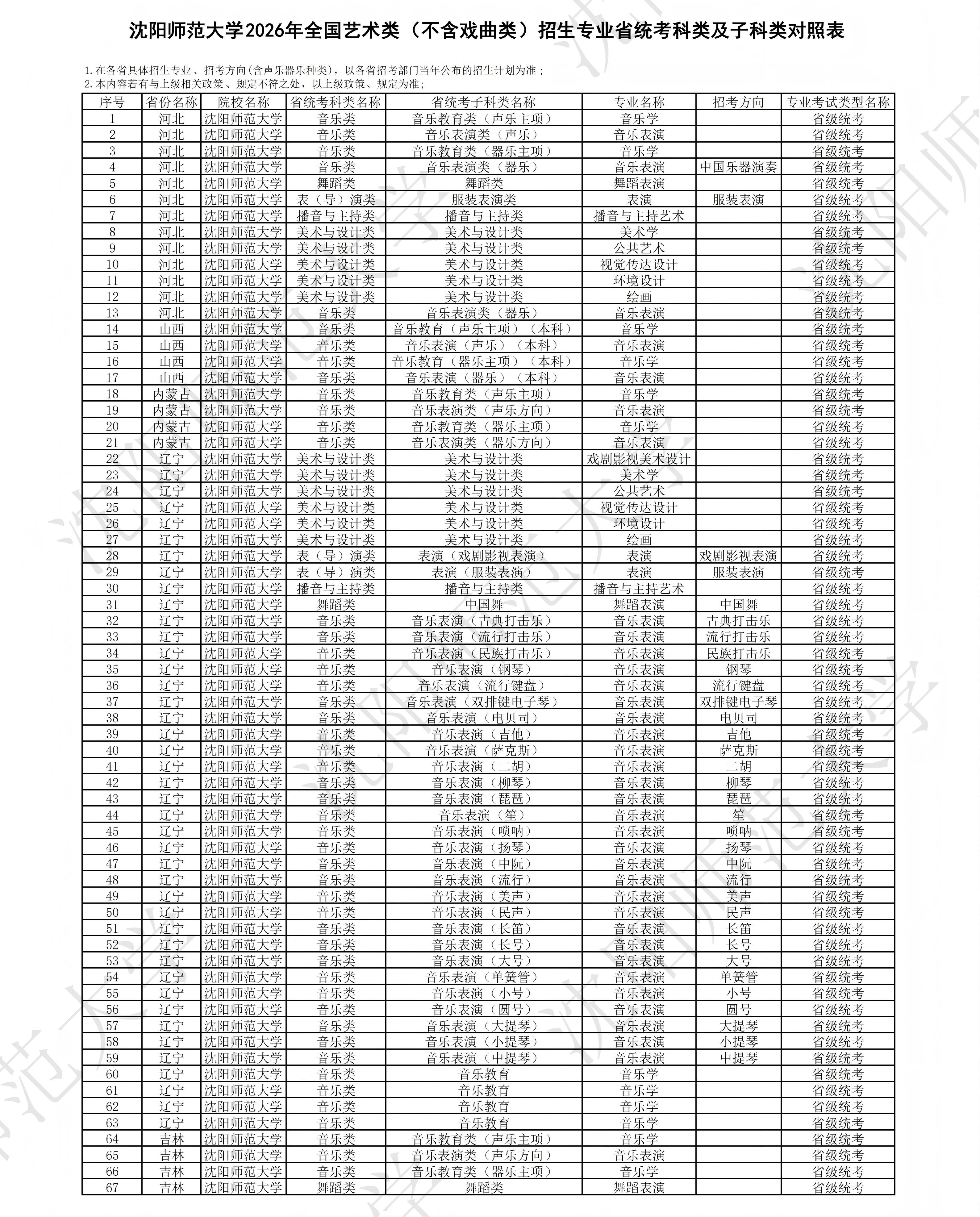 沈阳师范大学2026年艺术类拟招生专业及对应省级统考科类情况说明