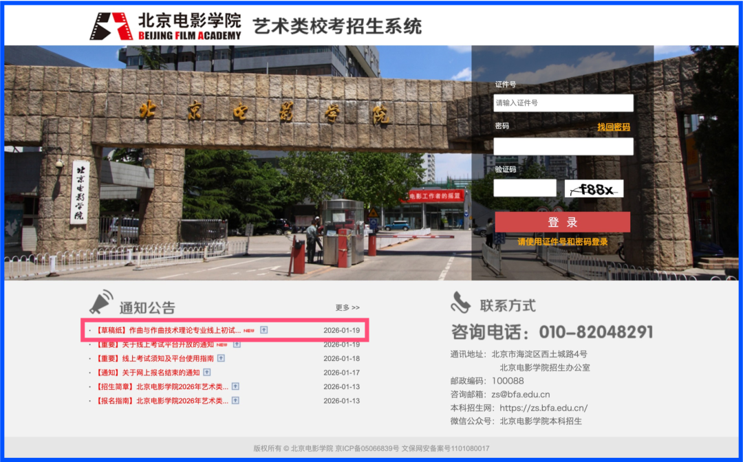 按照《北京电影学院2026年艺术类校考本科招生简章》的规定, 我校本科招生专业考试线上考试平台已于2026年1月19日中午12:00开放。 请考生尽快登录线上考试平台,完成确认考试、考前准备(人脸验证、设备检测、阅读考试须知、签署考试承诺书等)、考前练习 等步骤。请考生务必在正式考试前完成上述工作,以免影响正常考试。 考生须做好考前准备,及时参加模拟考试,准时参加正式考试。
