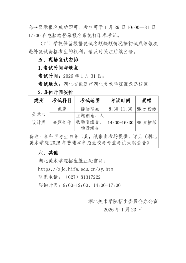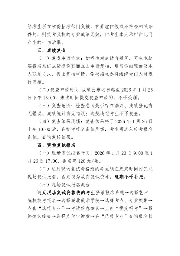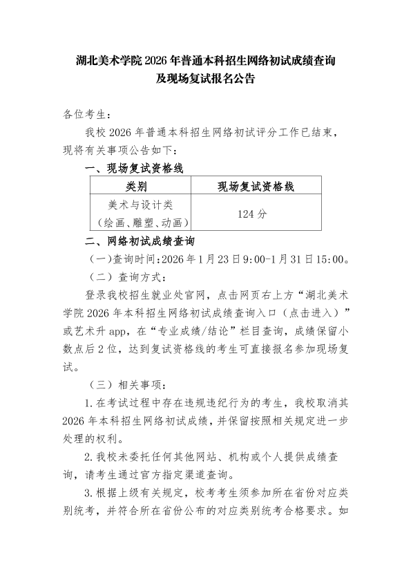 湖北美术学院2026年普通本科招生网络初试成绩查询及现场复试报名公告